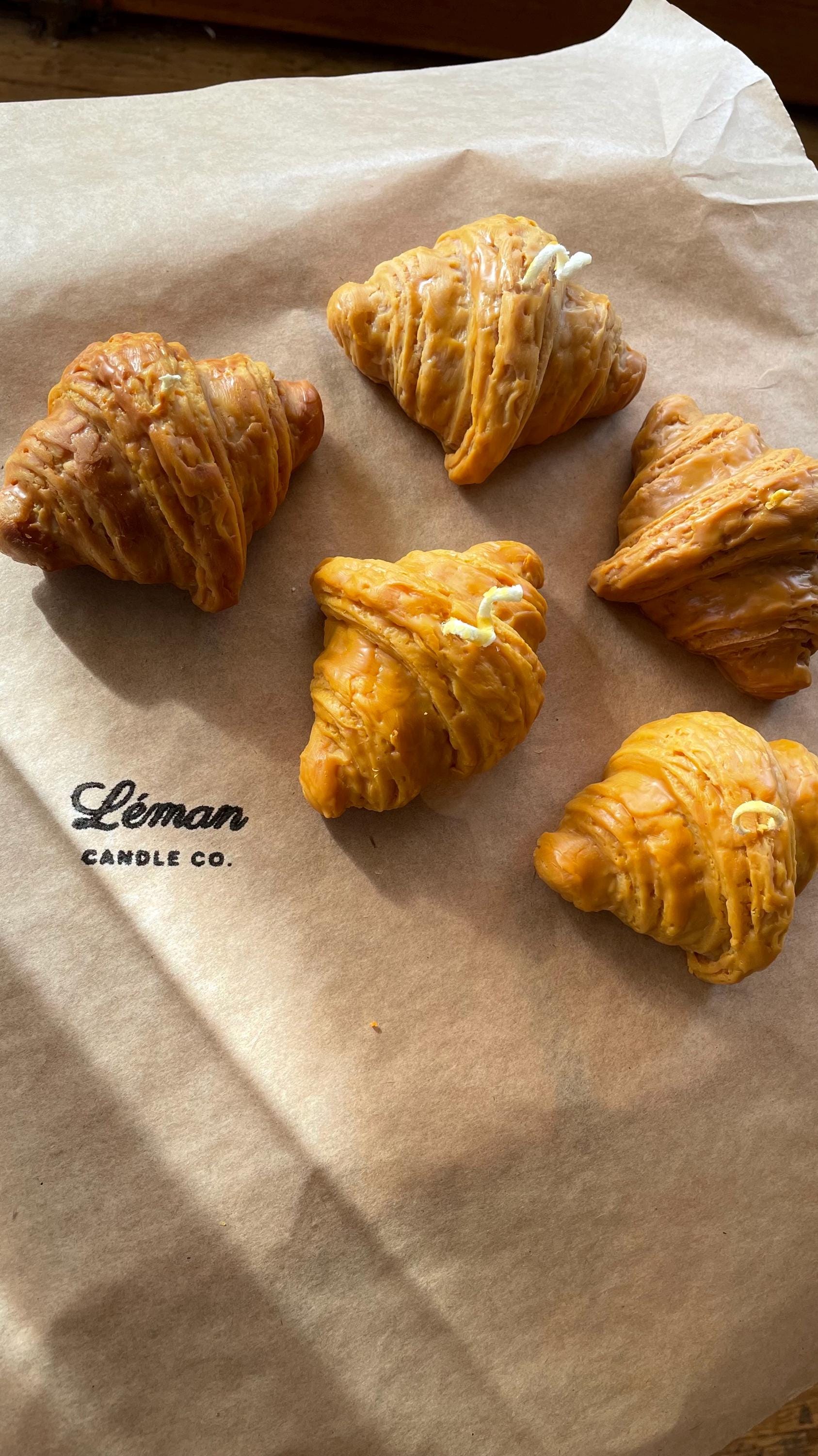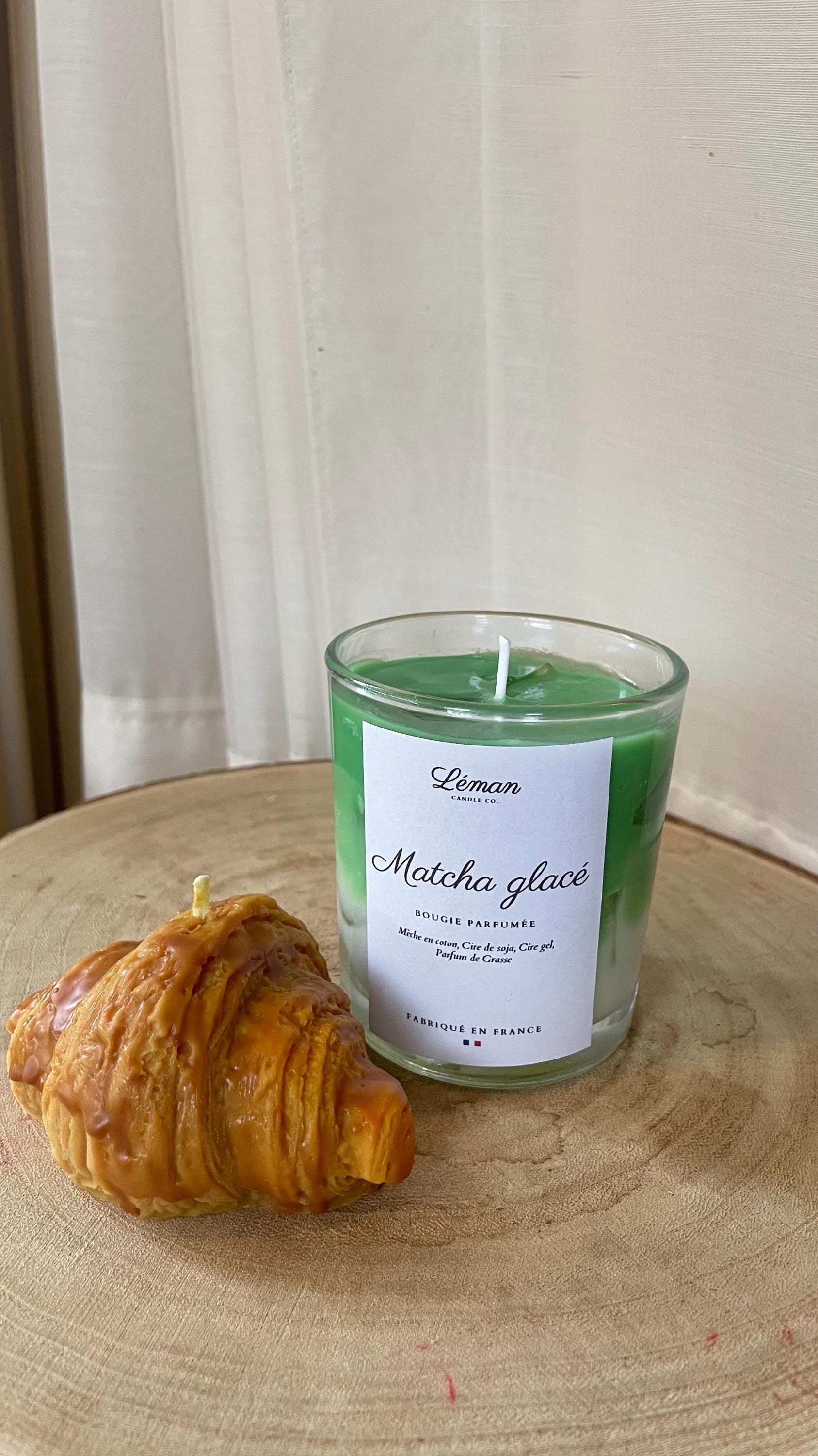 This set includes an Iced Matcha Latte Candle with realistic wax "ice cubes" and a flaky Croissant Candle, both handcrafted for a unique café-style home accent.