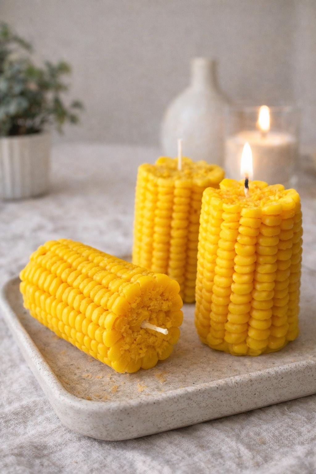 A hyper-realistic corn-shaped candle that looks just like real corn and smells like warm, buttery popcorn. This unique handmade candle adds a cozy, playful touch to any interior and instantly creates a nostalgic movie-night atmosphere.